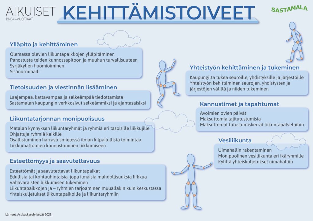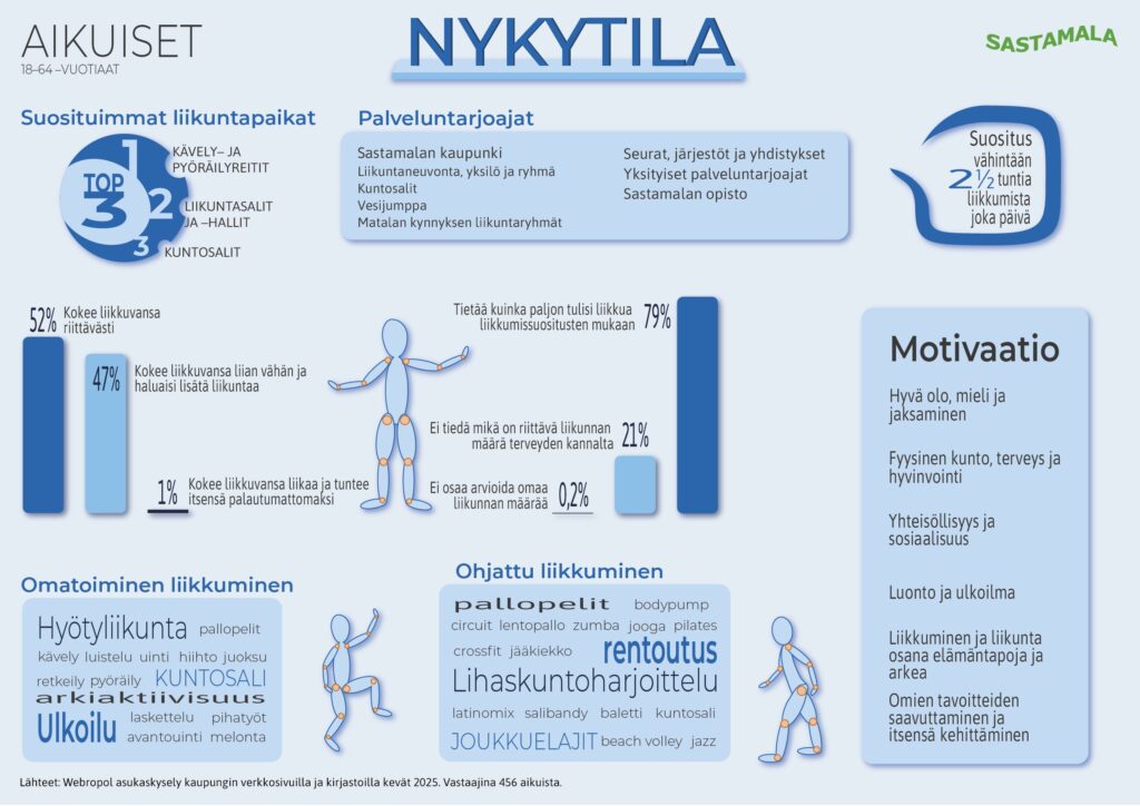 Asukaskysely 6.2.-16.3.2025. Asukaskyselyyn pystyi vastaamaan netissä sekä kirjallisesti kirjastoilla. Kyselyyn vastaamalla kuntalaiset pääsivät antamaan äänensä liikkumisohjelman suunnittelun toimenpiteisiin. Kyselyn avulla kerättiin arvokasta tietoa Sastamalan kaupungin asukkaiden liikkumisen nykytilasta, motivaatiosta sekä toiveita ja ideoita liikuntapalveluiden ja liikkumisympäristöjen kuten kävely- ja pyöräteiden, luontokohteiden kehittämiseksi.