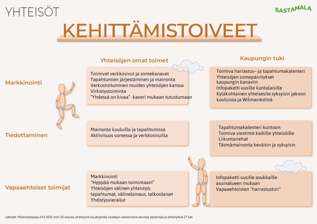 Kyselyn jälkeen järjestettiin yhteisötyöpaja 24.4.2025. Työpajassa osallistujat pääsivät kehittämään ja ideoimaan ratkaisuja kyselyssä nousseisiin haasteisiin niin seuran/yhdistyksen/järjestön kuin myös kaupungin näkökulmasta.
