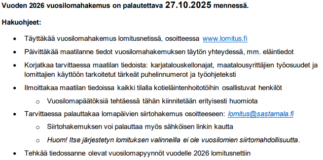 Jos et voi tehdä hakemusta lomitusnettiin, voit tehdä kirjallisen pyynnön sähköpostiin (lomitus@sastamala.fi) ennen lomituksen alkamista . Sähköpostiviestillä tehdyssä sijaisapuhakemuksessa on mainittava vähintään seuraavat tiedot: – hakijan nimi ja syntymäaika – sijaisavun alkamispäivä ja tieto, millä perusteella sijaisapua,(esim.työkyvyttömyys) haetaan.